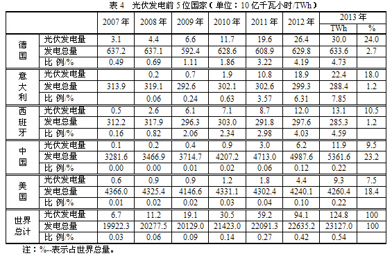 根據《BP Statistical Review of world energy 2014》的報告,2013年全球發電總量為23127.0 TWh,而光伏發電量為124.8 TWh,僅占發電總量的0.54%。光伏發電量最大的是德國,德國光伏發電也僅占4.73%,見表4。