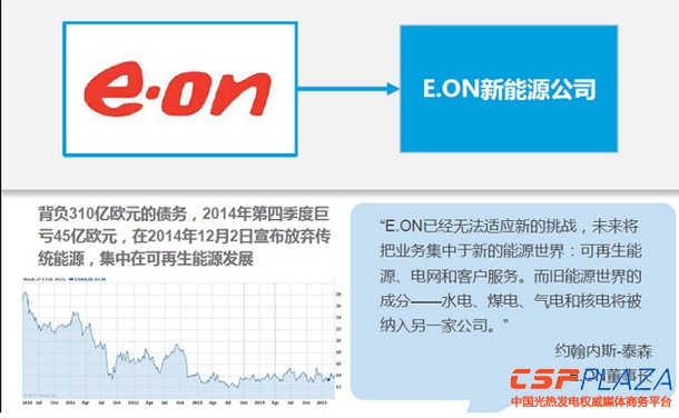 這是白堊紀的晚期,我們有機會可以從一個生物學家的角度,來看一下目前這個世界正在發生什么變化。我們把眼光看到德國,這是德國最大的能源企業E.ON,規模要超過德國西門子,去年年底E.ON挺不住,它在化石能源大規模虧損,最終決定公司一拆為二,新的公司做什么?保留一項主體業務不是化石能源,而是可再生能源、電力零售創新和互聯網相關的領域,包括一些電網業務。能源領域的一個變化是什么?看德國在可再生能源領域的創新,可再生能源占電力比例要在2020年達到45%的目標,德國在電力零售上也進行了大量的互聯網嘗試,這其實是一個氣侯在發生變化的國家。就像我們到了這樣一個島上,看到生物演化的結果,最先的恐龍已經倒下。所以我們看到的500強前面傳統能源企業的名單,他們是不是也會一步一步走向德國能源體系的演化結果呢?