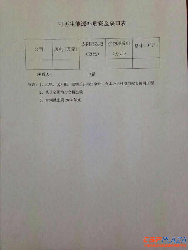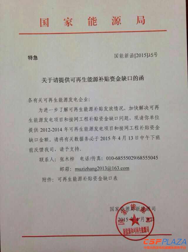 CSPPLAZA光熱發電網訊:國家能源局新能源和可再生能源司4月9日下發《關于請提供可再生能源補貼資金缺口的函》,并以特急文件形式下發。文件稱,相關可再生能源發電企業應按要求提供2012~2014可再生能源發電項目和接網工程補貼資金缺口金額,于2015年4月13日中午下班前反饋至新能源司。