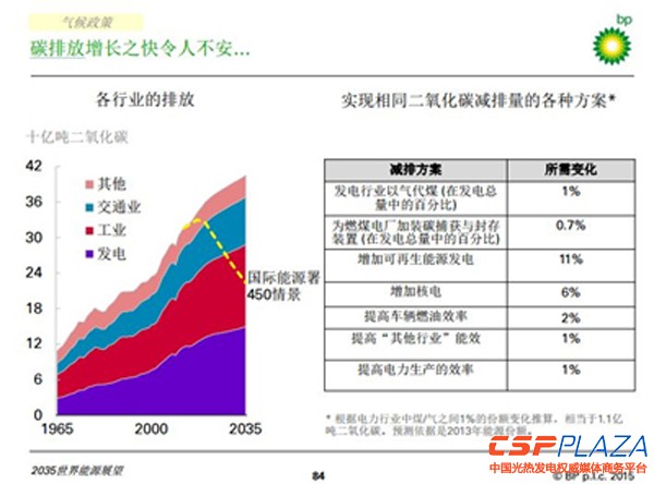 《展望》還通過對能源市場以及碳相關政策的變革進行預測,分析了截至2035年全球二氧化碳的排放情況。2035年前,預計排放量將以每年1%的速度增長,這段時期內總共增長25%。這將明 顯高于科學家所建議的增長軌跡,比如國際能源署的“450情景”。