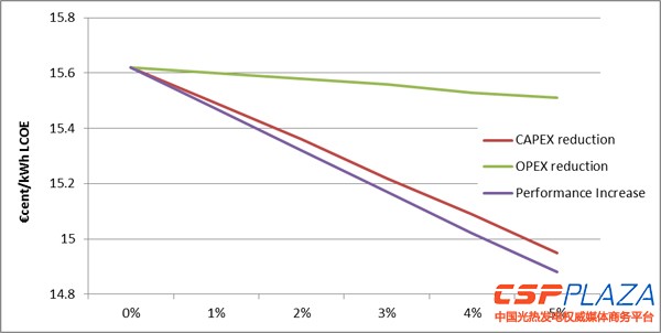 2013年,CSP Today針對可以降低光熱電站LCOE(平準化電力成本)的各種敏感性因素進行了研究分析并統計了相關數據。該項研究比較了三個方面的數據:投資成本下降5%,運維成本下降5%和電站性能改善后產能提高5%之間的關系。