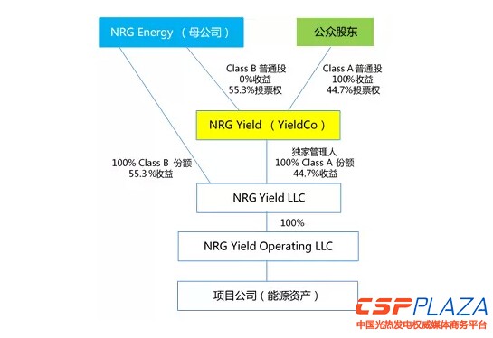 其次,母公司創設NRG Yield(YieldCO)并在紐交所公開上市融資。完成后公眾股東持有A類普通股,享有YieldCO的100%收益(economic interest)和44.7%投票權;母公司則持有B類普通股,不享有YieldCO收益但享有55.3%投票權。