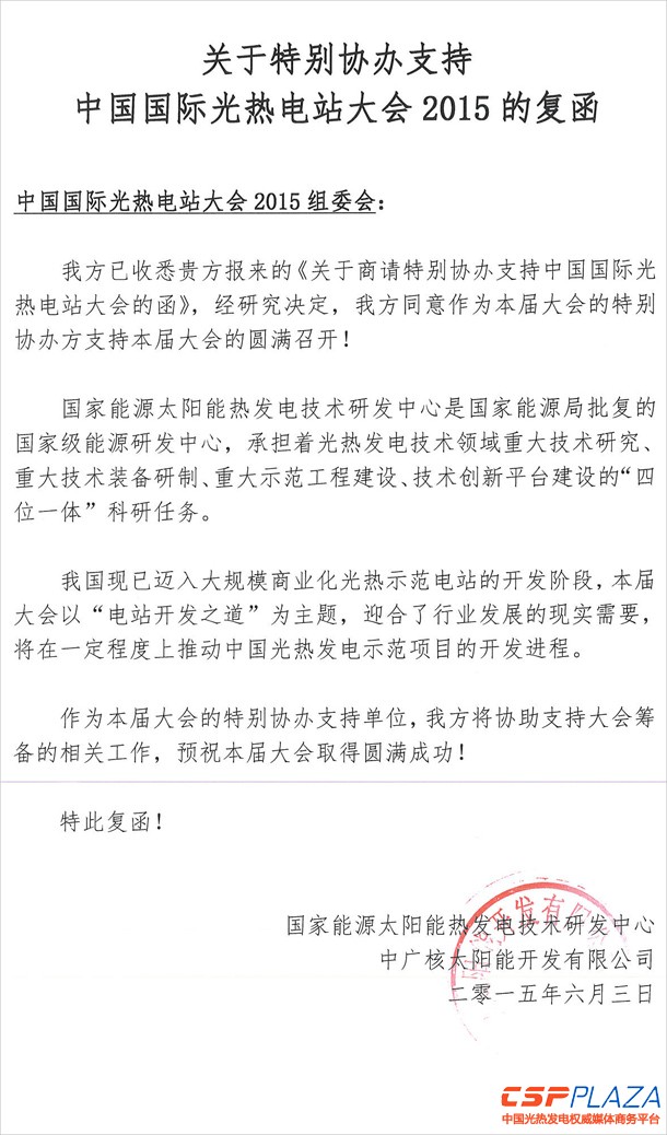 CSPPLAZA光熱發電網訊:中國國際光熱電站大會暨CSPPLAZA年會(CPC2015)日前獲得國家能源太陽能熱發電技術研發中心的特別協辦支持,其在《關于特別協辦支持中國國際光熱電站大會2015的復函》中表示,“作為本屆大會的特別協辦支持單位,我方將協助支持大會籌備的相關工作,預祝本屆大會取得圓滿成功!”