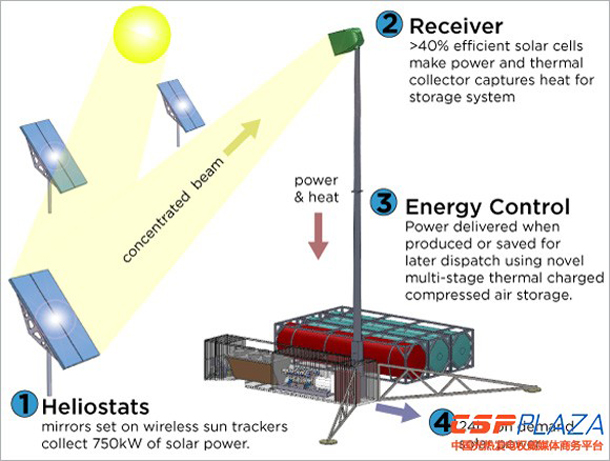 這種CSPV技術集合了光熱可廉價存儲、光伏發電成本較低的雙重優勢。750倍的聚光能量照射在高效聚光太陽能電池板上,一平方米的電池板可產出的電能是同等面積的普通電池板的1500倍。置于塔頂的能量接收器分為兩個部分,上層部分為熱量接收器,主要吸收紅外輻射,下層部分為聚光光伏電池板,主要吸收可見光。吸收的熱量被存入儲熱系統,聚光光伏電池發出的電能驅動壓縮機來壓縮空氣存入壓縮空氣罐中,發電時釋放壓縮空氣中的空氣驅動空氣透平發電,同時用儲熱系統加熱空氣,空氣受熱膨脹做功,發電效率獲得大幅提升。