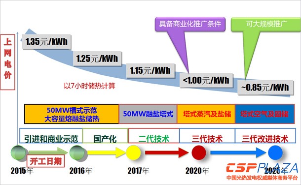 這是目標和路徑圖,我們堅信這是光熱應該說沒有定型,未來的潛力很大,說的技術都是大層面的,實際上里面還有很多創新的可以挖掘的內容,比如說本身是槽式或者是塔式,實際上還有很多變體。預計通過兩個五年計劃,最多應該可以降低到一塊錢以下的上網電價甚至更低,甚至可以到8毛5的水平。
