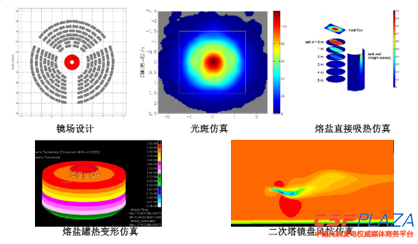 這是這個系統進場光學方面的光學效率,最后綜合效率現場測算下來54%, 完全不同于塔式的進場方式,完全是圓形環狀往外擴張,中間上面是對光斑的仿真,這次采用的是熔鹽直接加熱,熔鹽是沒有管道的,不走在管道,光直接加熱熔鹽,這就涉及到光在熔鹽里的投射,一層層加熱,到底能加熱多少升,這些實驗都是需要做的,這些都是理論方面的東西,包括熔鹽罐的設計,二次反射塔盤的抗風,這個不光是為了以后西部,現在在鹽城經常來一次臺風,所以說要做一些風抗設計。