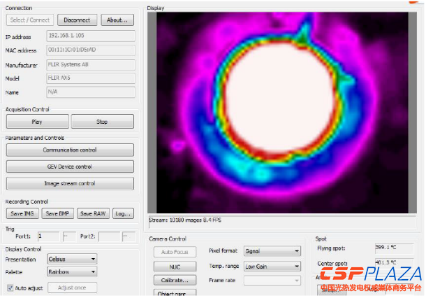 這是熔鹽的溫度測試,紫顏色主要是因為下面有低于3米以下的臺階,真正看紅顏色細圈里白顏色的部分,那塊是熔鹽,被加熱的熔鹽,做這個實驗是證明在吸熱器里熔鹽在同一表面沒有溫度分布。