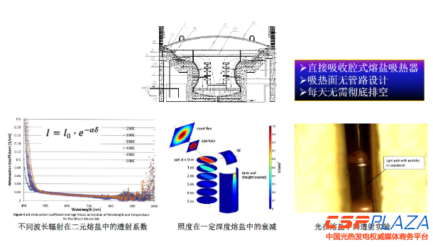 熔鹽儲罐的保溫測試,首先從根源上解決熔鹽安全性問題,上圖是吸熱器的截面圖,基本上是開口的,上面是一個自動開關的蓋子防塵防雨,晚上蓋起來,平時的時候太陽光直接照在吸熱器里面,左下角三張圖,物理性質的實驗,第一個不同波長的輻射在二元溶液中透射系數,第二個照度一定深度熔鹽中的衰減,第三個光在熔鹽中的投射,通過直接吸收的腔式熔鹽吸熱器,所有的吸熱面沒有任何管路設計,熔鹽不走管路凝固就沒有后果,每天不需要徹底的排空,這是塔式里最大的問題,每天早上要沖注,每天下午要排空,排不干凈不用承擔后果,是不是少了很多的問題。