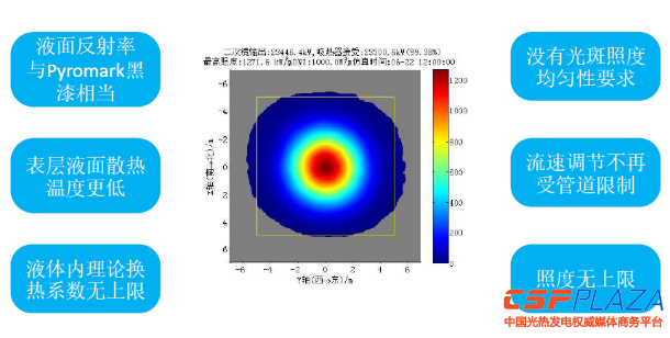 這樣一種形式的吸熱器可以大幅度提升集熱性能和對光方面的要求,這樣一種吸熱器,它液面的反射率相當于塔式里面Pyromark 黑漆。 第二它的表層液面溫度比底層低,它的散熱系數不是按照565度峰值來算的,它可能更低, 第三液體內的理論換熱系數是無上限的,在吸熱器將近7平方米全部是同一個溫度,它沒有階層沒有分布,因為理論換熱系數是很高很高的,在同一個液體里面。它對光斑均勻性沒有要求,只要光是照在吸熱器里面就能達到加熱熔鹽的效果,不用擔心過于集中了產生過熱點了把鋼管燒掉了,因為沒有鋼管,不需要這么昂貴的材料,在傳統里流速調解非常重要,這里面沒有流速調解,或者說流速調解不再受管道的限制,照度無上限,中間的光斑,這是一個商用電站的規模,中間紅點的照度是1.2兆瓦,我相信現在的塔式系列沒有一個這樣的照度存在,這太高了,任何基礎材料