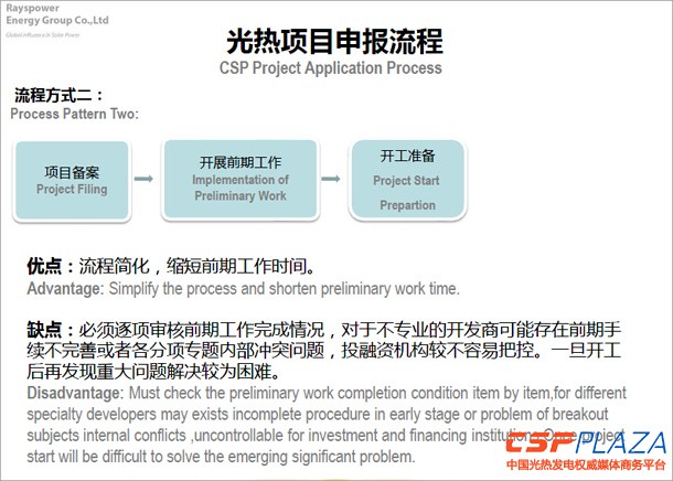 下面我就中國太陽能項目開發流程和關鍵點做個介紹 ,本介紹偏重于在中國市場上做項目開發的體制流程、政策流程,因為相對來說現在在中國做項目開發的參與方非常多,但是項目開發從根本意義上來說是非常嚴謹的事情,我們有其它的風電和光伏,項目開發相對來說做得比較草率,但從投資成本和解決問題上,后續還有一些緩和的機會。而開發光熱電站對技術要求非常高,因此項目開發前期就要考慮周全,并把所有的問題盡量提前解決掉。