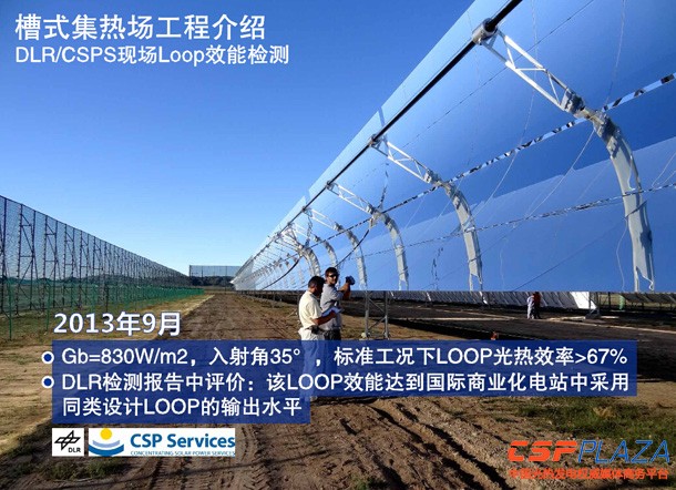 如圖,當時是Klaus Pottler先生跟他的同事以及我們內蒙的同事于2013年9月份在基地進行的檢測,根據當時實測的數據,Gb=830W/㎡,垂直于槽面入射角等于35度時,標準工況下LOOP的實際光熱轉化效率大于67%。在DLR同期出具的報告中也評價,這樣的光熱輸出效率基本上達到國際化電站采用同類設計的槽式LOOP的輸出水平,這個水平我們認為相當于ANDSOLⅠ項目的水平。
