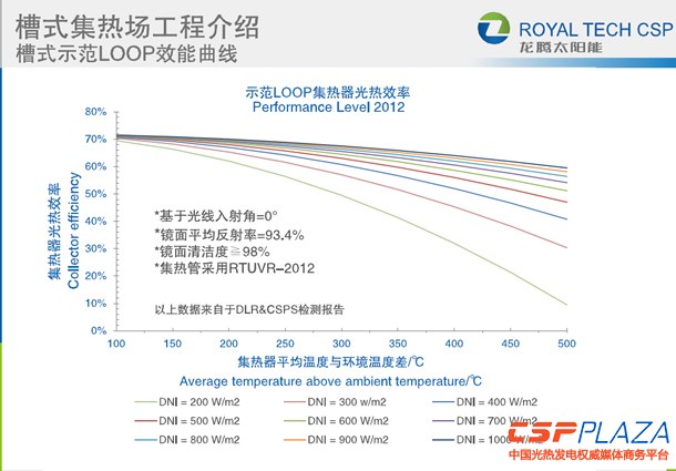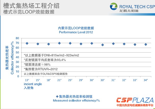 根據當時的實測數據得出的聚光器集熱效率曲線給出聚光器的輸出效率,我們把它定義成“Performance Level 2012”,是2012年我們的槽式裝備在內蒙古實際獲得的光熱效率的曲線,邊界條件的界定在于光線的入射角等于零度的時候,鏡面的平均反射率=93.4%,因為當時我們采用了國內多家企業的反射鏡,平均的反射效率是93.4%。鏡面的清潔度是≥98%,集熱管是龍騰的RTUVR-2012。檢測的曲線來源于實際的數據,是實測的實時溫度段的檢測效率,數據是分布在DNI值為815到923瓦每平方的區間,反射鏡平均反射率就跟剛才所說的一樣,其它的邊界條件也是一樣,我們可以看到在這種條件下,我們系統的光熱轉化效率可以保持在70%左右。