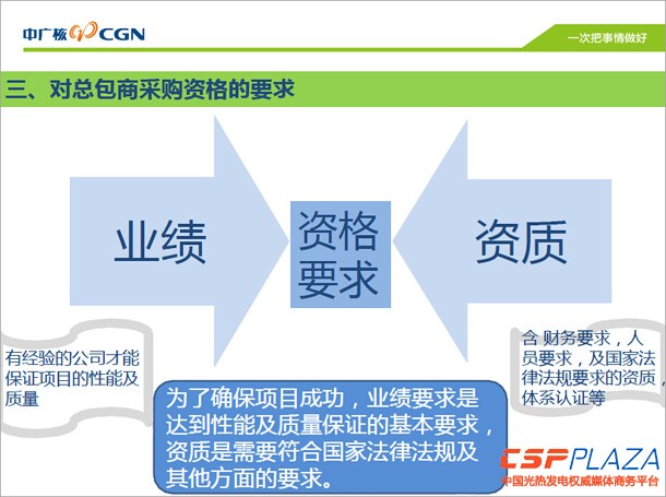 至于資質的要求,我們通常在設定資質的時候會考慮到財務的要求、人員的要求和國家法律法規要求等相關的資質和體系認證等等,所有的這些條件都是為了確保項目的成功。業績要求是達到性能和質量保證的基本要求,資質是需要符合國家法律法規和其它方面的要求。然后我們來看看對分包商采購資格的要求,我主要列出來了幾個主要的分包商。剛才提到了總承包商EPC,而從設計和施工方面來講,設計采購要考慮設計的業績和設計的資質,施工則要考慮施工的業績和資質。剛才提到商業化電站對運維也有一定的要求,因為運維成本也會決定商業化綜合成本,那么調試和運維也要考慮業績和資質,首先是調試的業績,然后是調試的資質,以及運維的業績和資質。所有的商業化項目都是為了確保運行成功,如果是沒有業績的分包商或者是承包商來做,就不能保證項目的性能和質量。