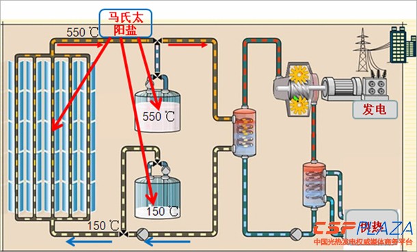 而且低熔點熔鹽的應用領域也很廣泛,我們主要是用其來做儲能,但它在工業、民用以及太陽能光熱發電領域都可以有很多的應用。低熔點熔鹽和馬氏太陽鹽所做的傳熱蓄熱系統是我們在馬老師低熔點熔鹽的基礎上自主研發的雙罐熔鹽儲能系統,結合了馬氏太陽鹽的一系列優勢,獨創的具有全部知識產權的馬氏太陽鹽傳熱蓄熱系統。