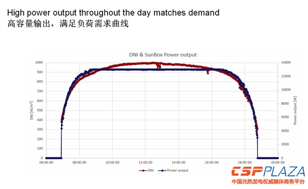 圖中是該電站的實際輸出曲線,早晨的時候很多人問過我一個問題:發電機怎么啟動?我們是自啟動,它會監測DNI的閥值,假設這個DNI閥值定在200或是280,當太陽光超過閥值的時候斯特林發動機會自動跟蹤太陽來進行發電,這個是非常高的一個輸出,采用雙軸跟蹤系統,所以輸出很穩定。