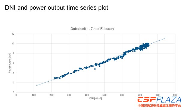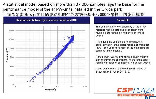 如圖,這是我們在鄂爾多斯的11千瓦的斯特林發動機基于37000個實際采樣點所得到的模型,你可以看到橫軸是DNI曲線,縱軸是輸出的功率,幾乎和DNI呈線性的關系,和外界的溫度和風速也是有關的。