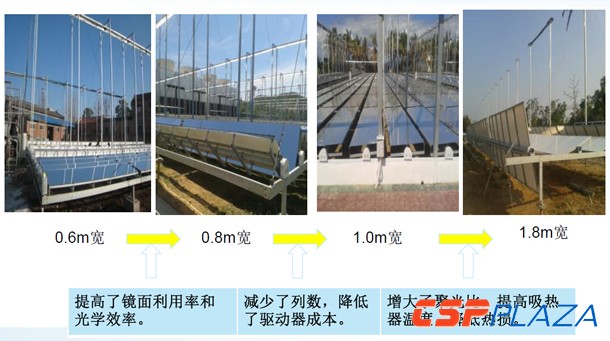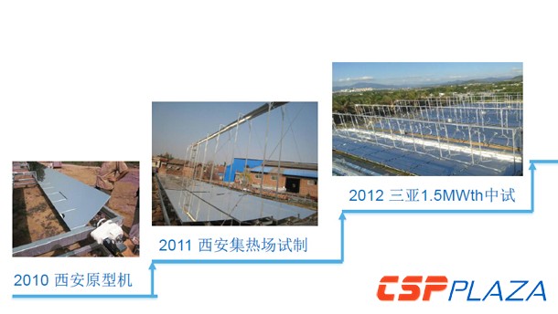 我們的菲涅爾發展經歷是這樣的,2010年西安做了一個原型機,2011年有一個集熱場的單元樣機,2012年建設了一個規模為1.5MWth的試驗系統,相當于是中小試。