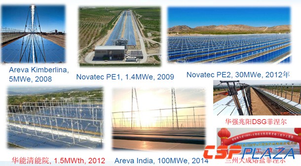談到大規模光熱并網發電技術,大家往往提到塔式和槽式比較多。我把我們關于線性菲涅爾光熱技術方面的研發工作給大家簡單匯報一下。先看看菲涅爾技術的發展歷程,2008年阿海琺在Kimberlina建設了一個5MWe的菲涅爾光熱發電系統,2009年和2012年,Novatec則分別建設了規模為1.4MWe的PE1和規模為30MWe的PE2菲涅爾光熱電站。華能清能院于2012年10月份在三亞建成了規模為1.5MWth的菲涅爾光熱發電系統,這是相當于一個天然氣和光熱發電組成的ISCC聯合循環系統,這個是阿海琺2014年在印度做的125MW的菲涅爾光熱電站。非常高興看到咱們國內也有華強兆陽(DSG菲涅爾發電技術)和蘭州大成也有菲涅爾光熱發電項目在開工建設。線性菲涅爾和槽式相比是有一定的相似性,但是也有不同,比如反熱鏡、支架、吸熱器、跟蹤裝置和基礎都有一些區別;它也有它的一些優勢,比如抗風性能,再一個是系統比較靈活,適應性好,水、導熱油、熔鹽也都可以使用;土地利用性高,因為它離地面低,遮擋比較少;清洗比較方便,因為它可以放平,進行大面積、高效率的清洗;成本比較低;效率雖然是相比槽式和塔式略有下降,但是成本下降的幅度更大,所以性價比也有一定優勢。