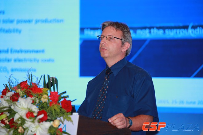 CSPPLAZA光熱發電網報道:德國CSPServices公司總經理Klaus Pottler出席了6月25~26日在京召開的中國國際光熱電站大會暨CSPPLAZA年會2015,并發表了“太陽能熱發電光場系統的質量保證方案”的主旨演講。
