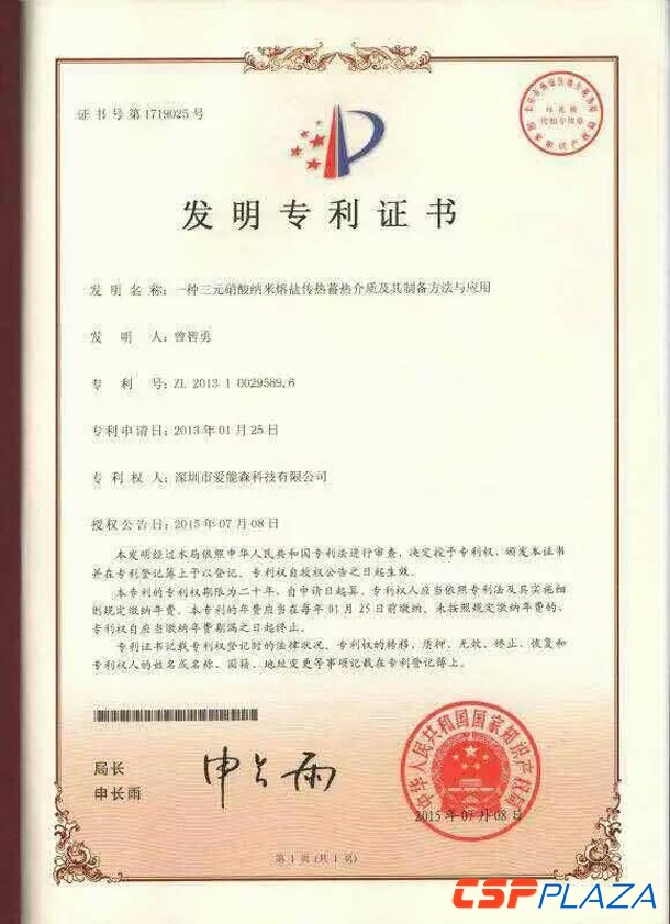 近日,深圳市愛能森科技有限公司申請的國家發明專利“一種三元硝酸納米熔鹽傳熱蓄熱介質及其制備方法與應用”順利通過審查,喜獲國家知識產權局授予的專利證書。