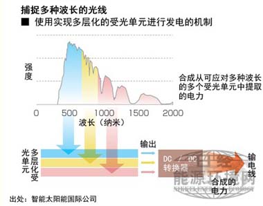 于是,智能太陽能國際在新系統的單元上重疊使用了多種半導體,可分別有效轉換“長、中、短”波長的光線。