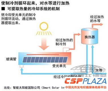 在管狀容器中央,設置由受光單元排列組成的棒狀太陽能電池模塊,縫隙中填滿制冷劑。從太陽能電池模塊吸收熱量之后汽化的制冷劑可通過位于管外的冷卻裝置變回液體。
