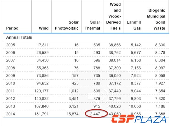 由于光熱發電項目從申請許可到建設投運往往需要5年之久,因此我們可以從上表中看到,雖然2008年ITC政策已經刺激了光熱發電行業的發展,但直到2014年光熱發電項目裝機量的劇烈增長才真正顯現出來。
