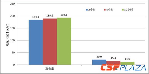 對于1000萬千瓦光伏+200萬千瓦光熱裝機,分別考慮光熱電站不同儲熱時間(2h,4h和10h),三種場景下的棄光率分別為10.17%、7.53%和5.82%。這凸顯了光熱發電儲熱系統的價值,儲熱時間越長,其對整體太陽能發電園區的上網電量增益越大。