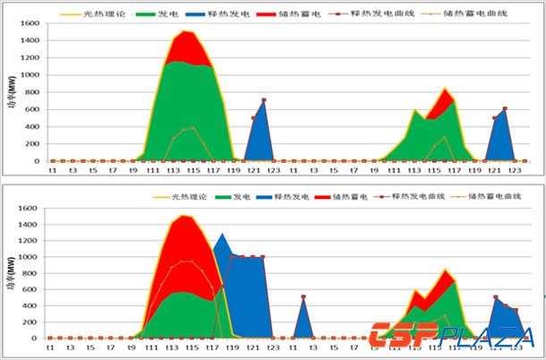 再以1000萬千瓦光伏+200萬千瓦光熱為例,假設(400萬千瓦光伏+200萬千瓦光熱)位于同一區域,則不同儲熱時間(2h和10h)的光熱電站發電輸出如下圖。上邊為2小時儲熱光熱電站的輸出圖,下邊為10小時儲熱光熱電站的輸出圖。分別模擬了天氣情況較好(左邊曲線)和天氣不太好(右邊曲線)的出力情況。