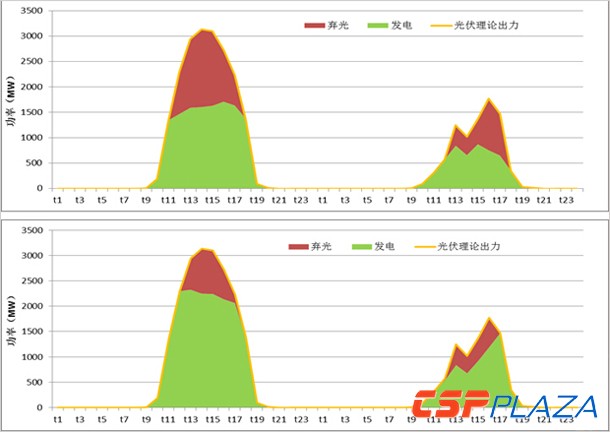 而下圖為在1000萬千瓦光伏+200萬千瓦光熱裝機下,假設(400萬千瓦光伏+200萬千瓦)光熱位于同一區域,配置不同儲熱時間(2h和10h)光熱電站時,400萬千瓦光伏電站的輸出功率圖。上邊為配2小時儲熱光熱電站時光伏電站的輸出圖,下邊為配10小時儲熱光熱電站時光伏電站的輸出圖。分別模擬了天氣情況較好(左邊曲線)和天氣不太好(右邊曲線)的出力情況。由此圖可見,配10小時儲熱光熱電站時,光伏棄光率明顯降低。