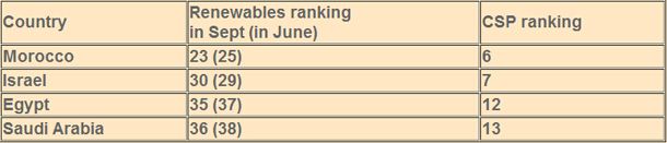 CSPPLAZA光熱發電網訊:據安永會計師事務所(Ernst & Young)發布的全球最具吸引力的可再生能源市場最新排名顯示,盡管排名仍舊在10名以外,但摩洛哥、埃及和沙特阿拉伯的排名均略有提升。但具體到光熱發電領域,以上三國和以色列均位居全球最具吸引力的光熱發電市場的前13名以內。
