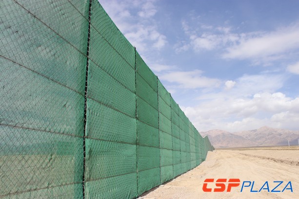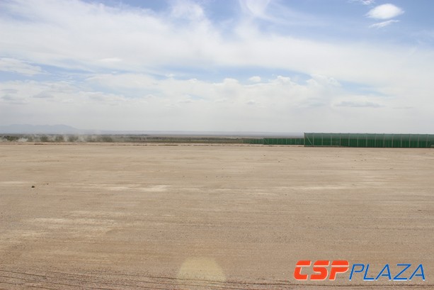 該項目的場平工作此前就已完成,防風墻也早已設置完畢。記者在現場看到,約8米高的防風墻矗立在場址周圍,這些防風墻未來將大大降低外來風速,減小沙塵對場內集熱系統的不利影響。