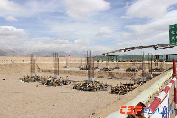 該項目占地面積約2.5km2,地勢北高南低,南北向自然坡度約為3%~4%,對比周邊地貌和目前場址情況,可以想象場平工作量之大,從現場情況來看,場平工作完成出色。本項目集熱場采用階梯布置方案,從北到南共設置了六階平臺,總計192個標準槽式集熱回路將分布安裝于這六階平臺上。