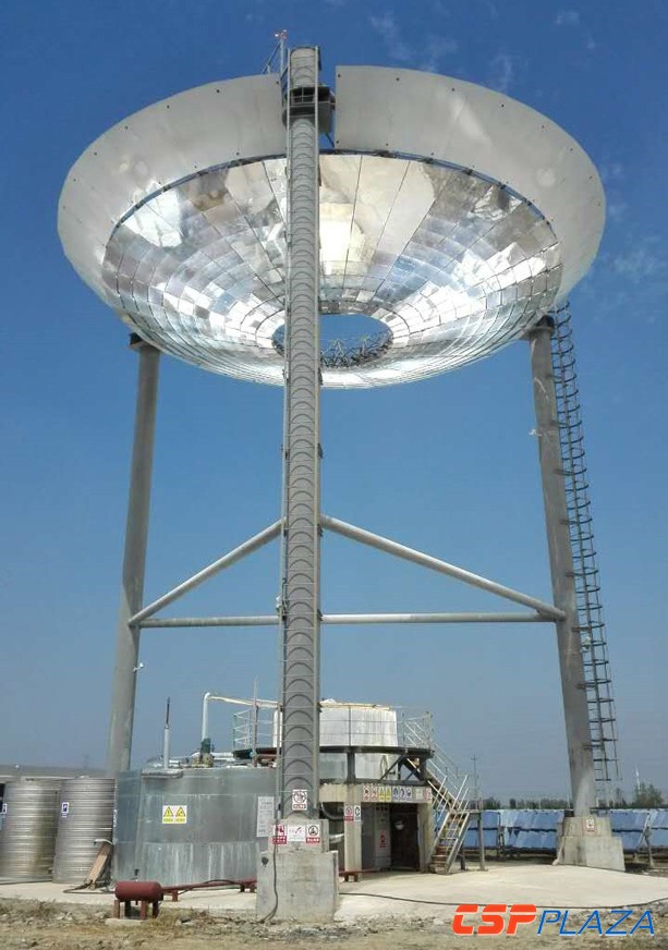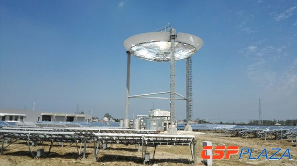 該項目位于江蘇鹽城,裝機規模300KWt,采用160副定日鏡和直接加熱式熔鹽吸熱器。目前已開始進行公開展示,可現場演示鏡場追日,二次聚光反射到下置吸熱器上將熔鹽加熱至500℃,熔鹽再與水換熱,推動汽輪機發電的全過程。鑫晨光熱歡迎行業人士到項目現場實地參觀考察。