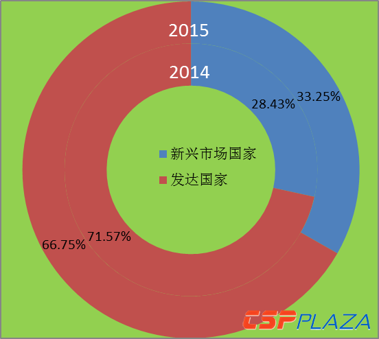 圖5 2014、2015“500強”發達國家與新興市場國家上榜企業總營收占比圖