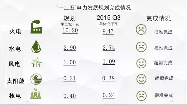 1. “十二五”能源答卷:光伏、風電裝機指標超額完成,火電、核電等指標基本無法完成。