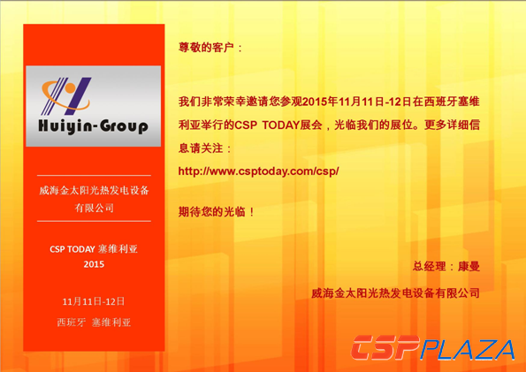 CSPPLAZA光熱發電網訊:2015年11月11日-12日,由CSP TODAY主辦的光熱發電展會將在西班牙塞維利亞舉行,國際知名真空集熱管生產商威海金太陽光熱發電設備有限公司(又稱匯銀集團,以下簡稱威海金太陽)也將以參展商的身份參與此次大會。