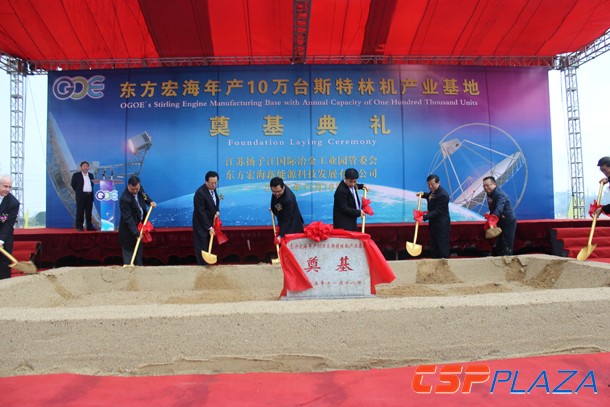 東方宏海總裁、董事長王振聲在產業基地的奠基儀式上表示,這次東方宏海同時舉行“張家港光熱發電示范園啟動儀式”、“年產1萬臺生產線產品下線儀式”、“年產10萬臺產業基地奠基典禮”的系列活動,“標志著東方宏海的斯特林產品已經實現了由產品研發,向產業批量化生產的轉變,這是世界斯特林產業的一件大事,必將因此載入斯特林機的產業發展史。”