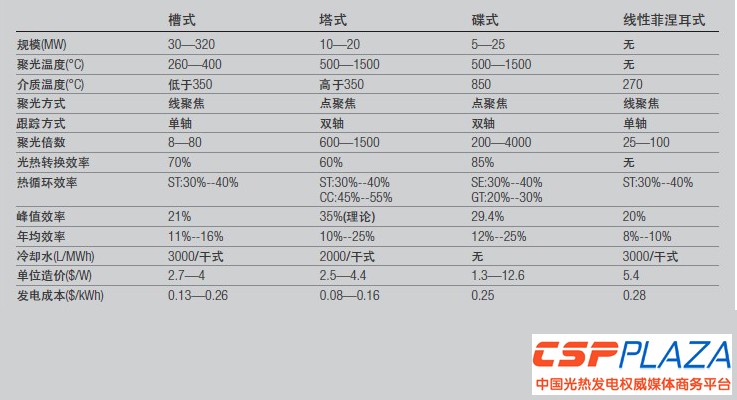 太陽能熱發電四種技術的參數對比表(ST:蒸汽輪機;GT:燃氣輪機;CC:聯合循環;SE:斯特林機)