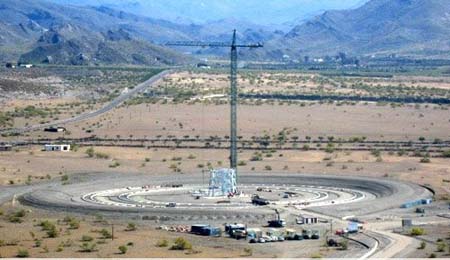 這個“可變幾何”太陽能光熱發電實驗設施由帶旋轉接收平臺的集熱塔和鏡場系統組成。其特殊的鏡場系統安裝了環形鐵軌,可以保證定日鏡可沿鐵軌滑動變換位置。在集熱塔的頂部,安裝了一個可旋轉的由混凝土澆筑的鋼結構平臺,重約3500公斤,直徑8米,可控制集熱接收器的朝向,這是世界上首個此種類型的集熱塔設施。