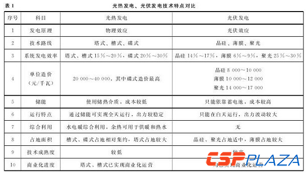 光熱發電和光伏發電的主要技術特點對比如下表所示。