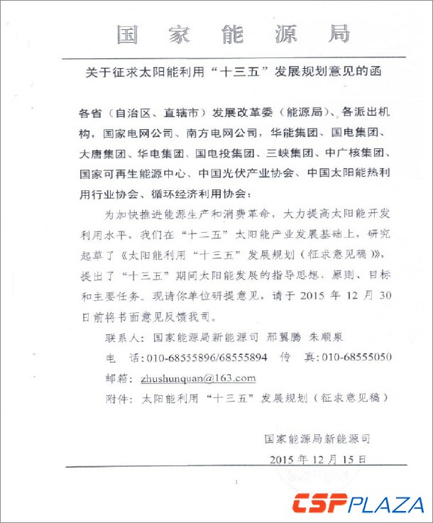 CSPPLAZA光熱發電網訊:國家能源局于12月15日向各省(自治區、直轄市)發改委能源局等有關部門下發《太陽能利用十三五發展規劃征求意見稿》(簡稱意見稿),要求于12月30日前將書面意見反饋至國家能源局新能源司。