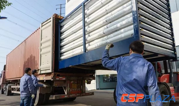 CSPPLAZA光熱發電網訊:12月29日,常州龍騰太陽能熱電設備有限公司向國際市場某50MW商業化槽式電站供應的首批2055支高溫真空集熱管正式發貨。按一個600米Euro Trough槽式集熱回路需144只集熱管估算,這批集熱管可滿足約14個標準回路的安裝需求。而按每支集熱管4000元人民幣估算,此筆訂單價值約為800余萬元。