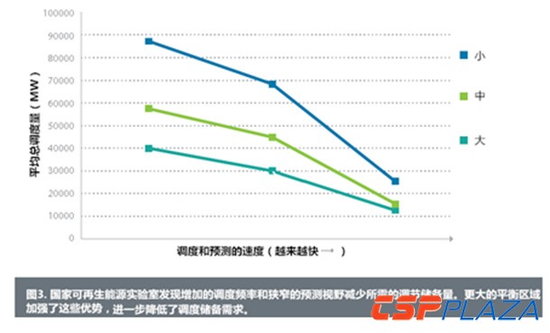 電網整合的研究表明,發電機頻繁的調度(間隔5或15分鐘)能夠提高系統的效率,降低平衡系統所需的儲備量,并且使更多可變的可再生能源發電并入系統。快速調度可以使系統從現有單元來訪問儲量,并且只需要很少甚至沒有額外的費用。它也可以減少調節儲量的需求,這是最昂貴的一部分花費,因為當系統經常重新調度時,負載和發電之間在瞬間會有偏差。例如,西部風能和太陽能集成化研究表明,頻繁的調度對系統最小化調節非常重要。每5或15分鐘調度資源,(而不是每一個小時)減少了機組爬坡,提供負載跟蹤。研究還發現,風能和太陽能的可變性在管理需求上的影響比每小時調度監管發電機組的影響要小。