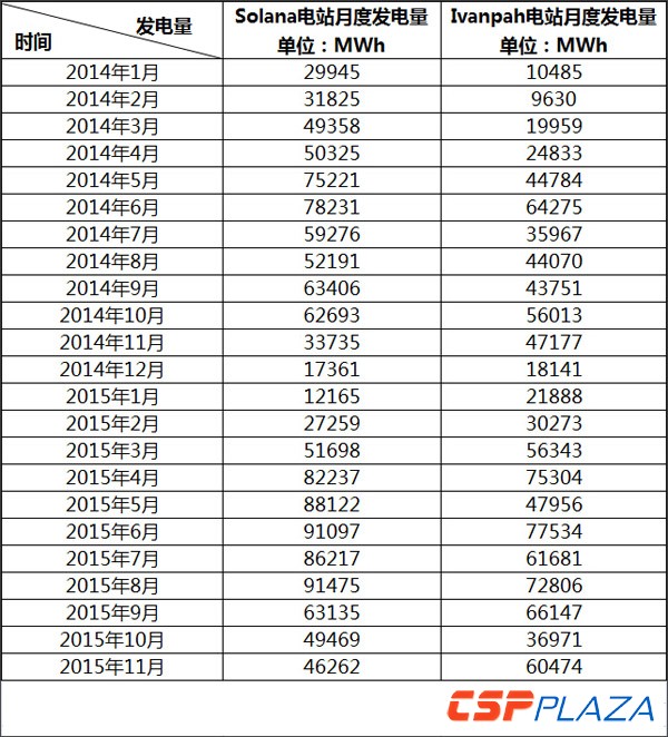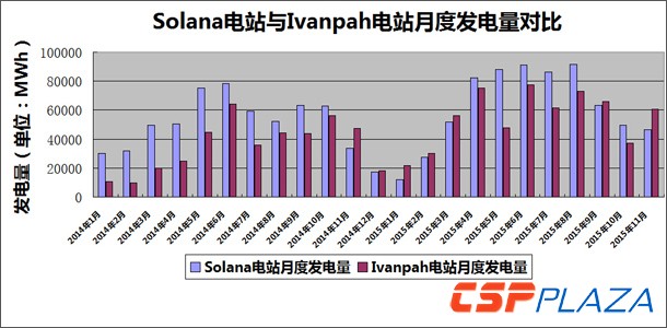 表:Solana和Ivanpah兩大電站的月發電量統計