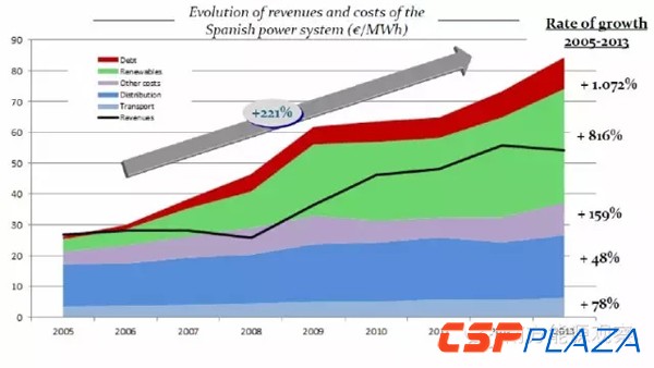 在這份西班牙工業能源旅游部關于2013年啟動的“新電改”的報告中,總結高電價的原因時,提到:“根據CEER(CouncilofEuropeanEnergyregulators,歐洲能源監管委員會)的統計,西班牙是歐洲每兆千瓦時給予可再生能源支持力度最大的國家”。