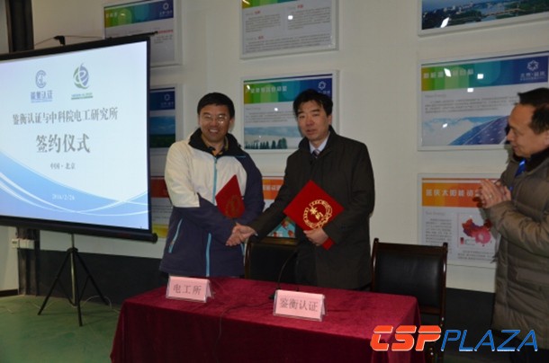 為確保太陽能熱發電產品質量的可信度,以標準為基礎開展認證是對產品質量進行有效地監督和管理,促進產品質量水平不斷提高的有效手段。在此次平臺啟動活動中,聯盟成員單位代表也共同見證了中科院電工所太陽能熱發電設備檢測中心與北京鑒衡認證中心的簽約儀式,在相關檢測標準和技術的基礎上,開展對太陽能熱發電產品的認證工作。