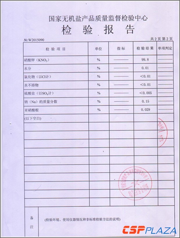 圖:國家無機鹽產品質量監督檢驗中心為上海鹽湖文通化工有限公司硝酸鉀產品出具的檢測報告