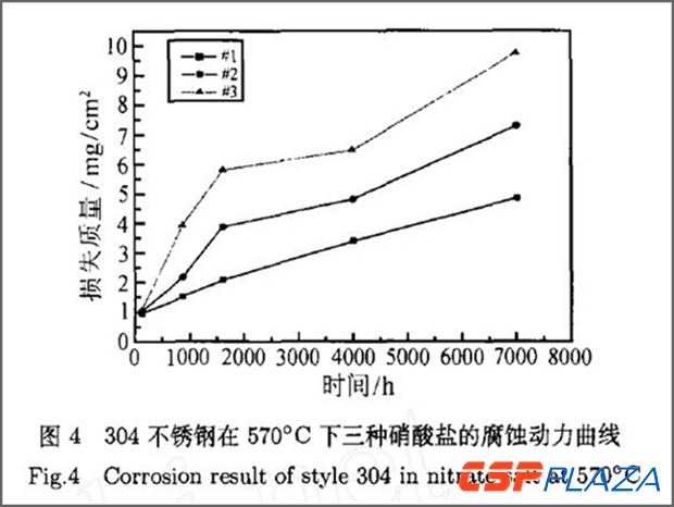 據劉斌提供的相關論文資料介紹,硝酸鉀和硝酸鈉的混合鹽對常見的不銹鋼和鋼材腐蝕性較小,已成功地在美國SolarTwo太陽能熱發電站中運用。在應用不銹鋼材料之前,美國可再生能源實驗室的Bradshaw對不銹鋼和碳鋼在三種混合硝酸鉀和硝酸鈉中的腐蝕行為進行了詳細的實驗(結果見下圖)。