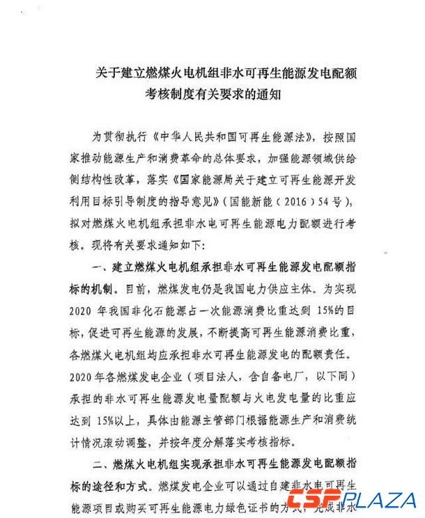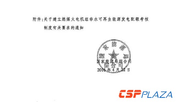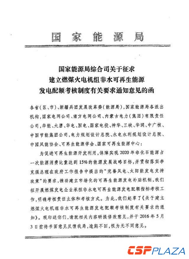 CSPPLAZA光熱發電網訊:2016年4月22日,國家能源局官發布重要通知,《國家能源局綜合司關于征求建立燃煤火電機組非水可再生能源發電配額考核制度有關要求通知意見的函》,文件要求對于未完成非水可再生能源配額要求的燃煤發電企業取消其發電業務許可證。